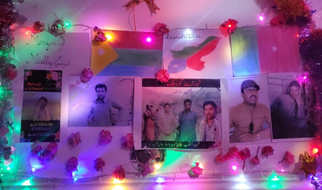 مشکے: نو سال پیش گورجک ءَ زورگریں پاکستانی لشکر ءِ دست ءَ شھید بوتگیں سالونکیں شھید اجاز، شھید باسد ندیم، شھید شھنواز ءُ شھید آپتاب ءِ سالروچ ءَ کھول ءِ نیمگ ءَ دیوانے برجم دارگ بوتگ۔